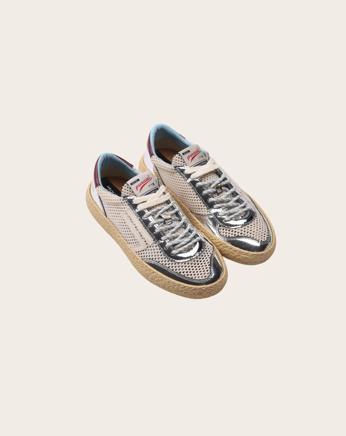 - Cuir végétalien argenté et maille gris clair, avec logo blanc et détails bordeaux. Semelle extérieure vanille et doubles lacets bleu clair et ivoire.