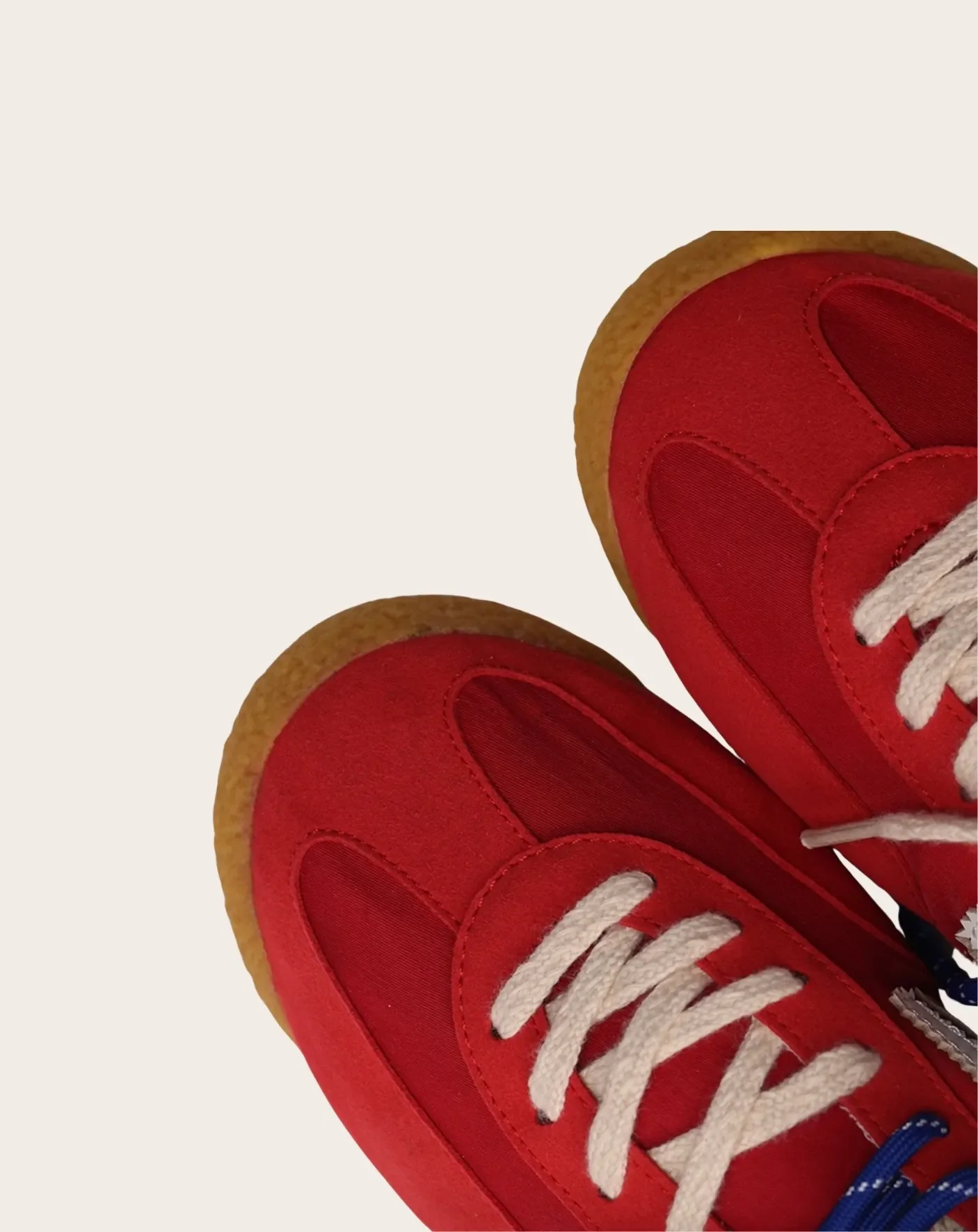 - Nylon rouge et microsuède avec logo blanc et détails rouges. Détails ambre, blanc cassé et beige sur la semelle extérieure, et doubles lacets bleus et blancs cassés.