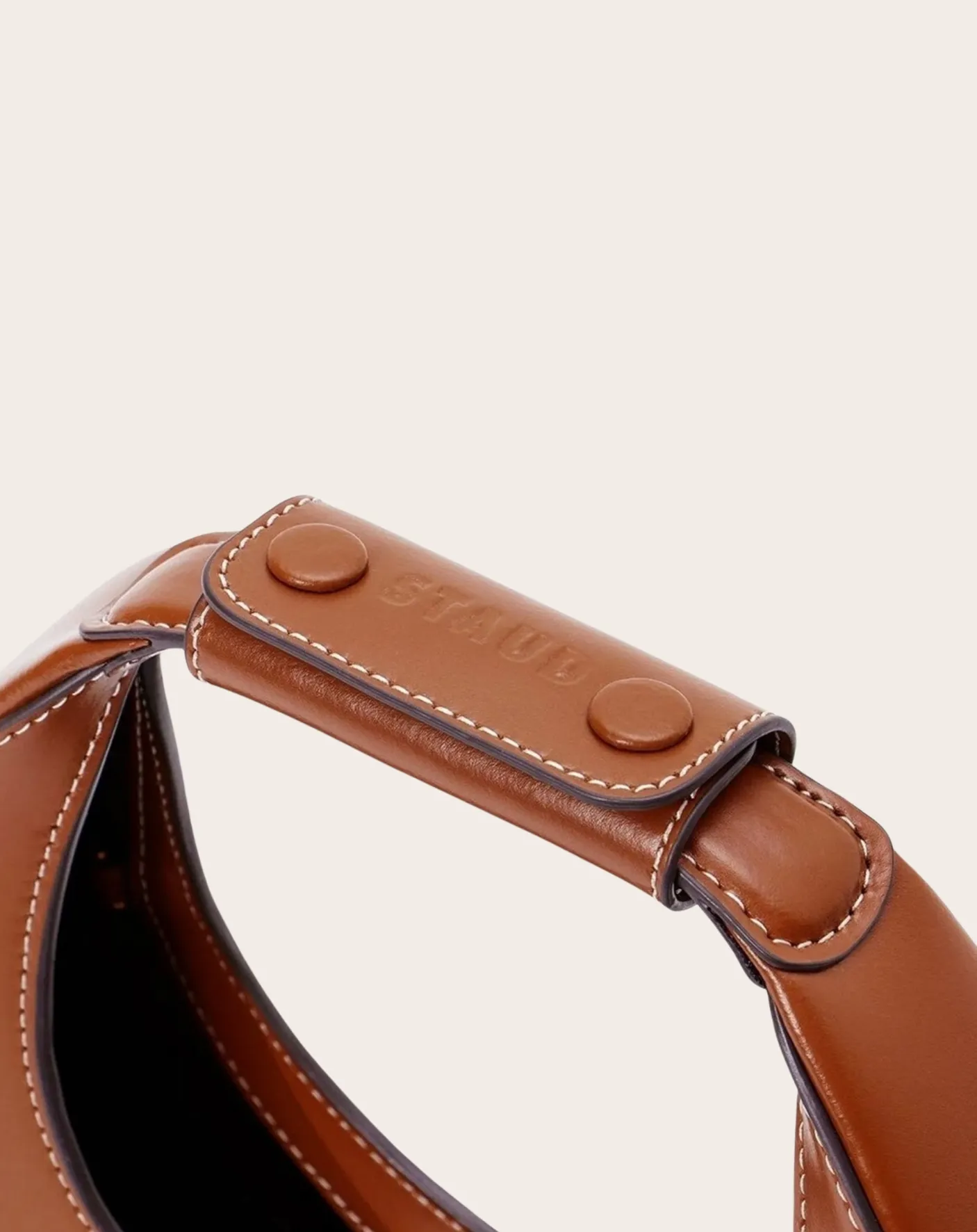 - Le Mini Moon de Staud séduit par sa silhouette demi-lune moderne et épurée. Confectionné en cuir lisse couleur tan, ce sac compact accueille les essentiels du quotidien. Élégant et facile à porter, il se glisse aussi bien dans un look décontracté que plus habillé.